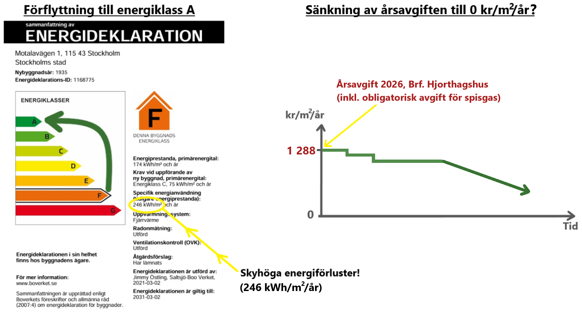 Höjningarna av årsavgiften med 10 procent som infördes den 1 januari 2025 och 3 procent 1 januari 2026 behövdes inte. Föreningens energiförluster kan enkelt minskas med belopp motsvarande de intäkter som höjningarna ger. När energiförluster byggs bort, vidtas permanenta åtgärder som låser energianvändningen på en lägre nivå. Att hantera ökade energikostnader genom att återkommande höja årsavgiften leder fel: orimliga boendekostnader, nedpressat värde på bostadsrätterna och finansiell instabilitet!