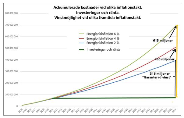 The chart above shows that even at the guaranteed inflation rate of 2 percent, the yield is about SEK 316 million, or an average of SEK 9 million/year. If the average energy price inflation instead becomes a fully possible 6 percent, a profit of about SEK 615 million is created, which corresponds to an annual average profit of about SEK 17 million/year.