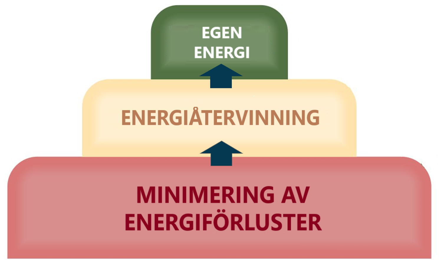 När energiförlusterna har minskats och värmeåtervinning installerats kommer våra byggnader att behöva 35 – 40 procent av ursprunglig värmeenergi. För att en värmepump ska leverera denna värmeenergi krävs i genomsnitt cirka 10 procent elenergi av föreningens ursprungliga totala energianvändning.