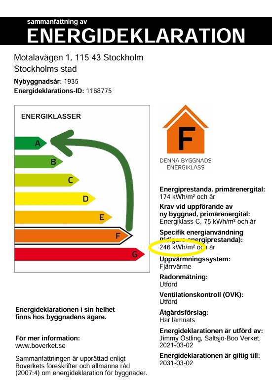 Föreningen köpte i utgångsläget energi motsvarande 246 kWh/m2/år. Minskning av värmeförlusterna har gett en förflyttning först till cirka 160 kWh/m2/år, sedan ner till cirka 88 kWh/m2/år genom återvinning av värmeenergi. För att en värmepump ska ge 88 kWh/m2/år krävs cirka 25 kWh/m2/år el. Denna el, cirka 390 MWh/år, kan föreningens egna tak ge.